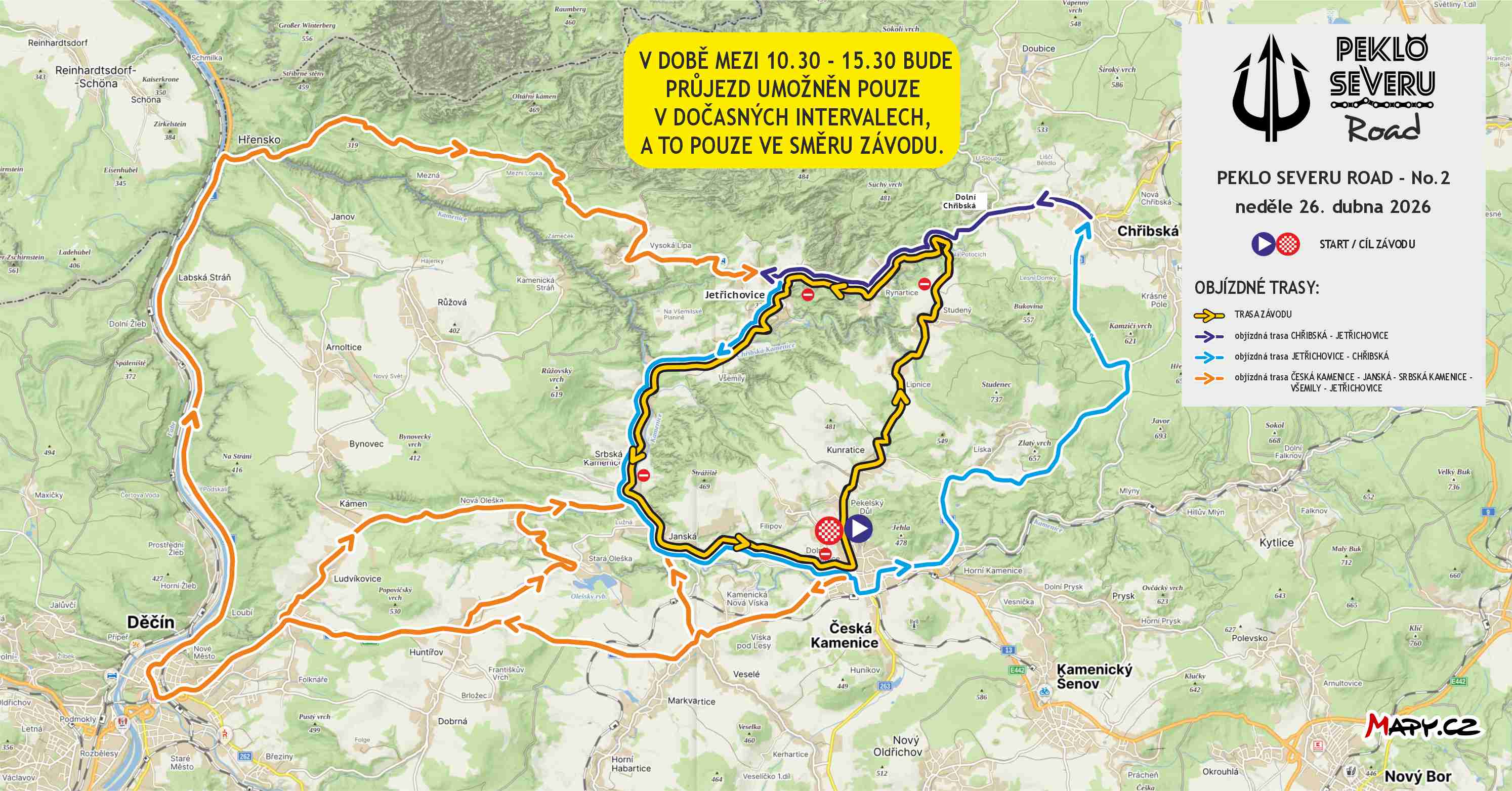 | Česká Kamenice - Jánská - Srbská Kamenice - Všemily - Jetřichovice | Česká Kamenice - Děčín - Hřensko - Jetřichovice ; dále do Všemil a Srbské Kamenice za závodem po trase závodu | 10:30 - 15:30 |