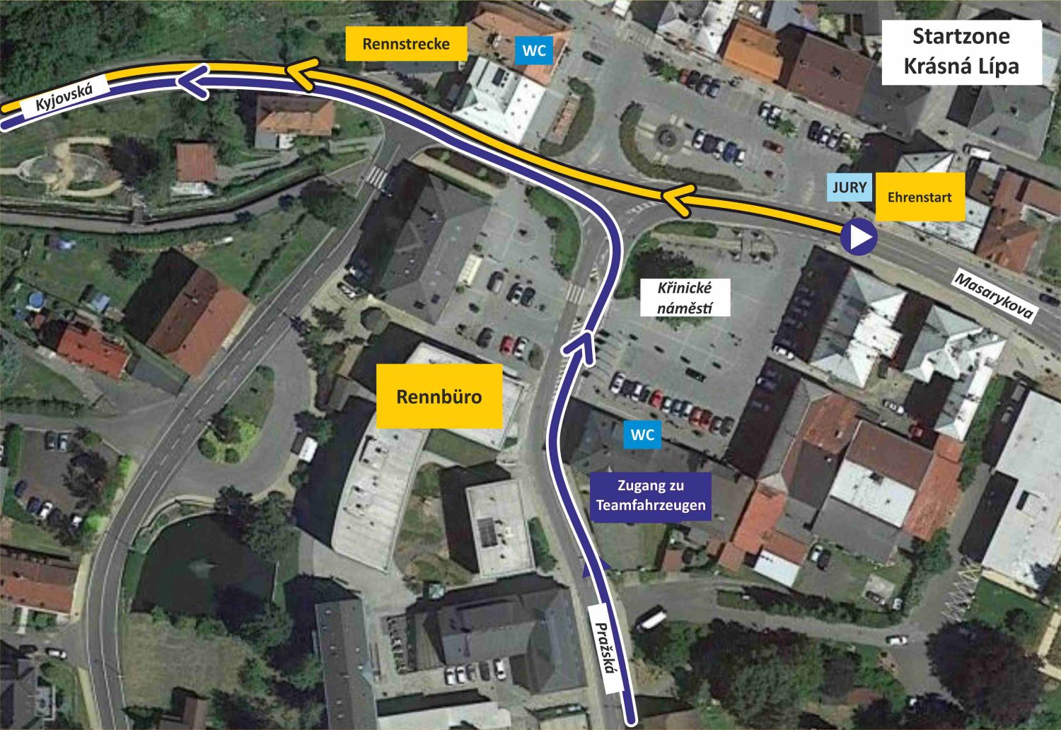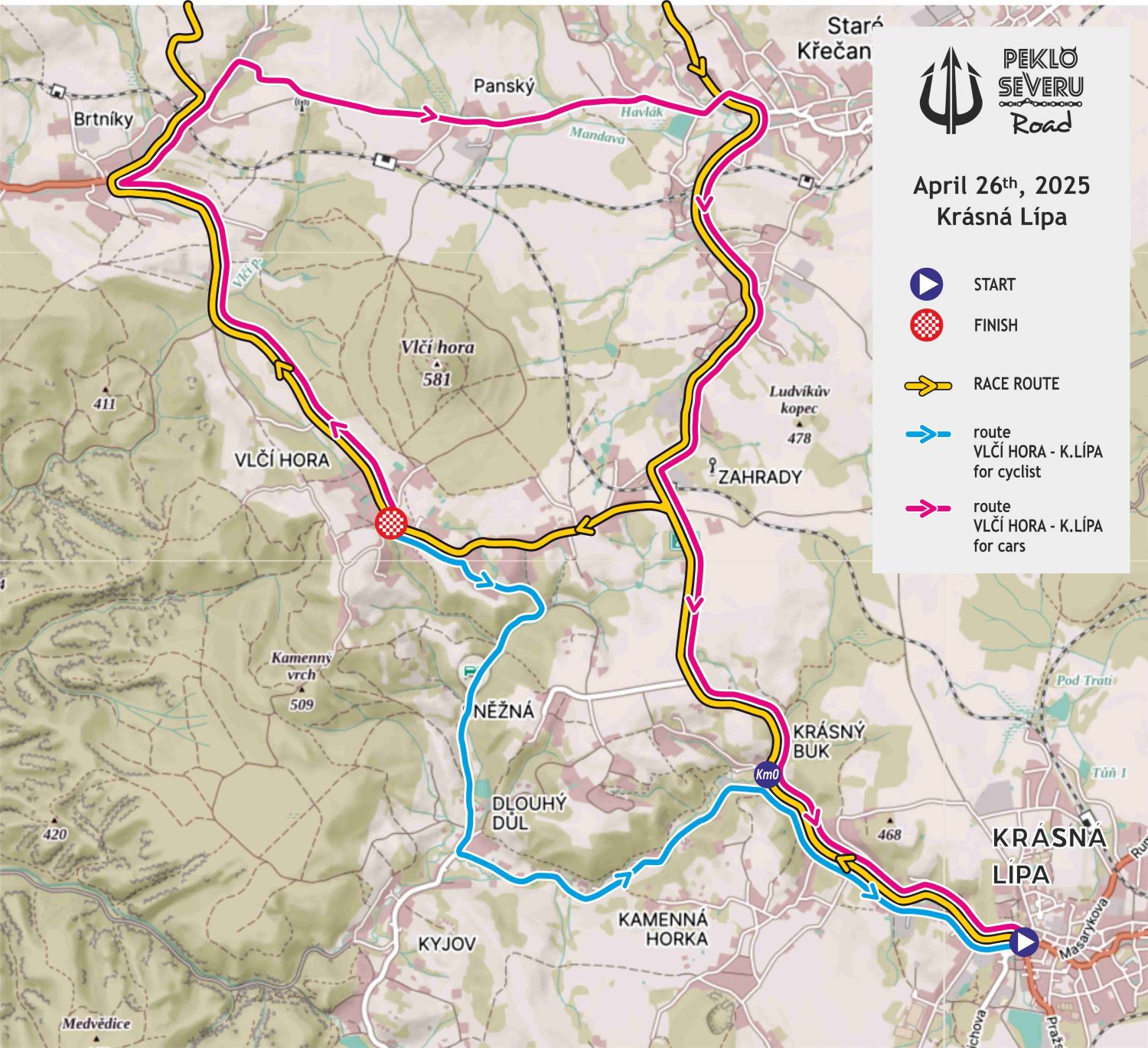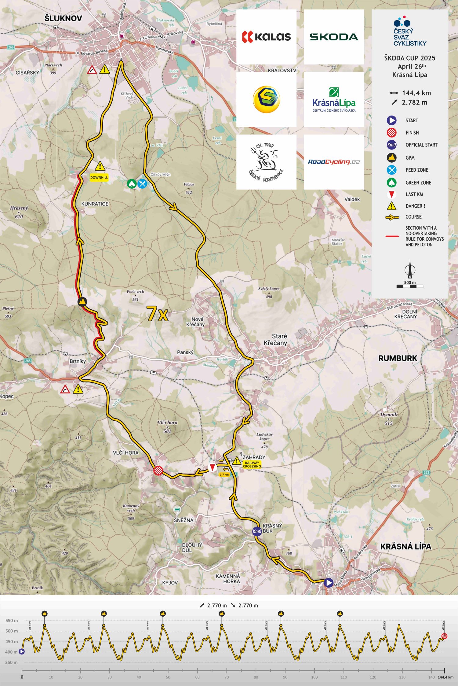 Route: Zeremonieller Start auf dem Křinické Platz in Krásná Lípa – KM 0 Ende des Krásná Lípa – Zahrady – Vlčí Hora – Brtníky – Kunratice – Šluknov – Staré Křečany – Zahrady – Vlčí Hora
