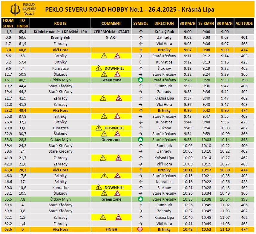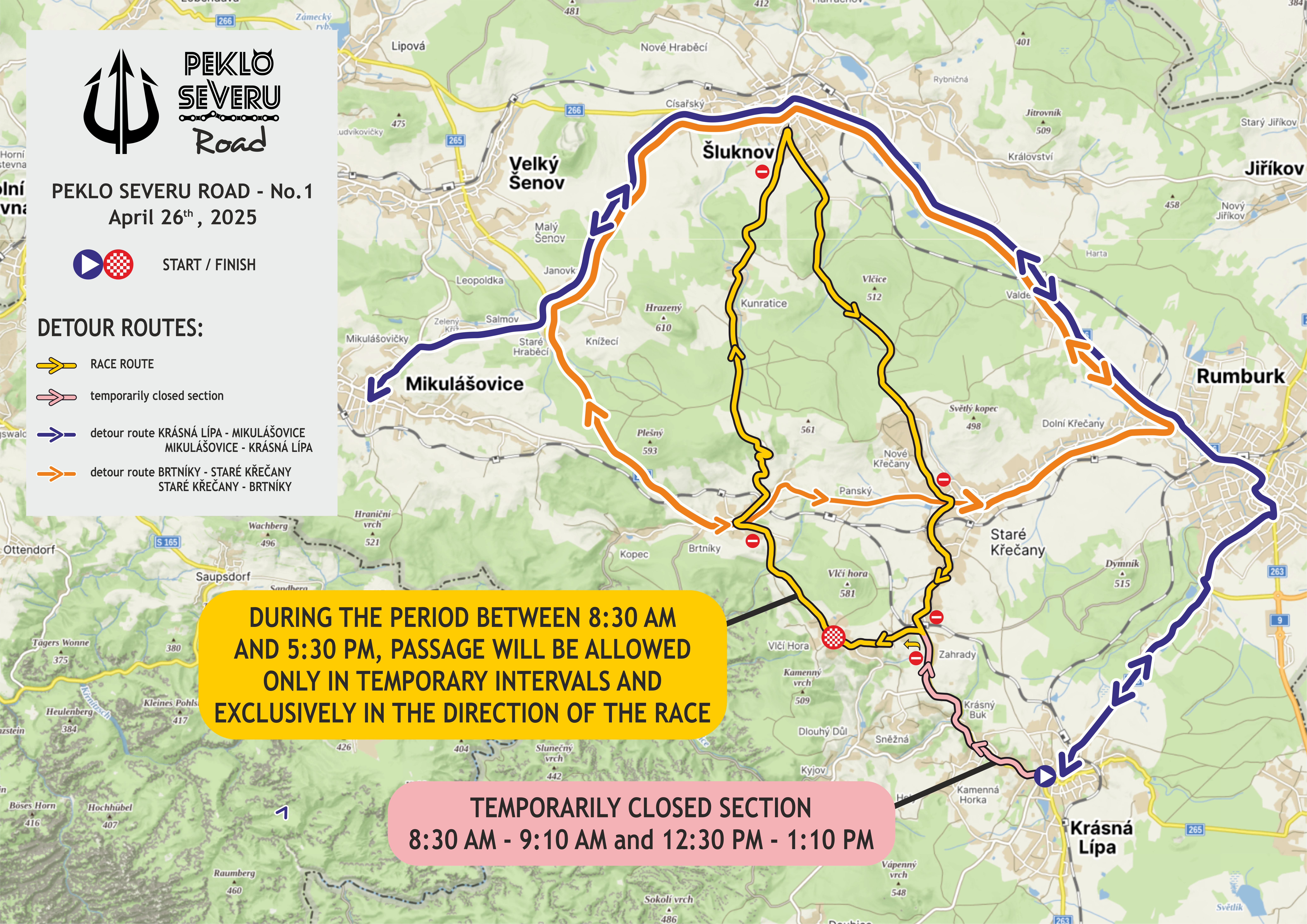 Race route: Ceremony start squre in Krásná Lípa – KM 0 end of the Krásná Lípa – Zahrady – Vlčí Hora – Brtníky – Kunratice – Šluknov – Staré Křečany – Zahrady – Vlčí Hora